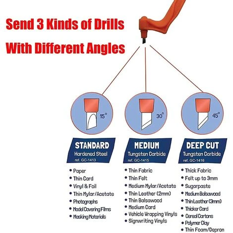 - Jedes Werkzeug wird mit 3 austauschbaren Bohrern mit unterschiedlichen Winkeln geliefert. Unser Schneidewerkzeug funktioniert wie ein Stift, schneidet wie ein Messer! Mit dem rutschfesten Messerkörper ist es einfacher und flexibler zu bedienen.